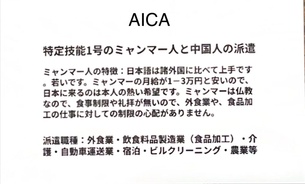 AICA株式会社ではミャンマー人や中国人の人材派遣を主に行なっております。ミャンマー人は日本語が諸外国に比べてとても上手で、若い人が多いです。ミャンマー人の月給は1〜3万円とかなり安く、日本に来ることを熱望している子が多いです。ミャンマー人は仏教徒なので、食事制限や礼拝のしきたりが無く、外食業や食品加工の仕事に関して、支障がありません。